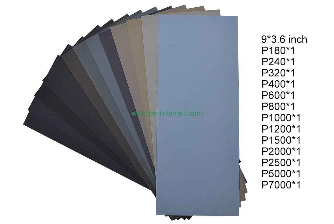 9inch x 3.6inch Waterproof Abrasive Sandpaper. Using for woodturning, metal finishing. It is durable and could be used in water. The price is based on one pack consist of 13 different grits ( #180, #240, #320, #400, #600, #800, #1000, #1200, #1500, #2000, #2500, #5000, #7000).